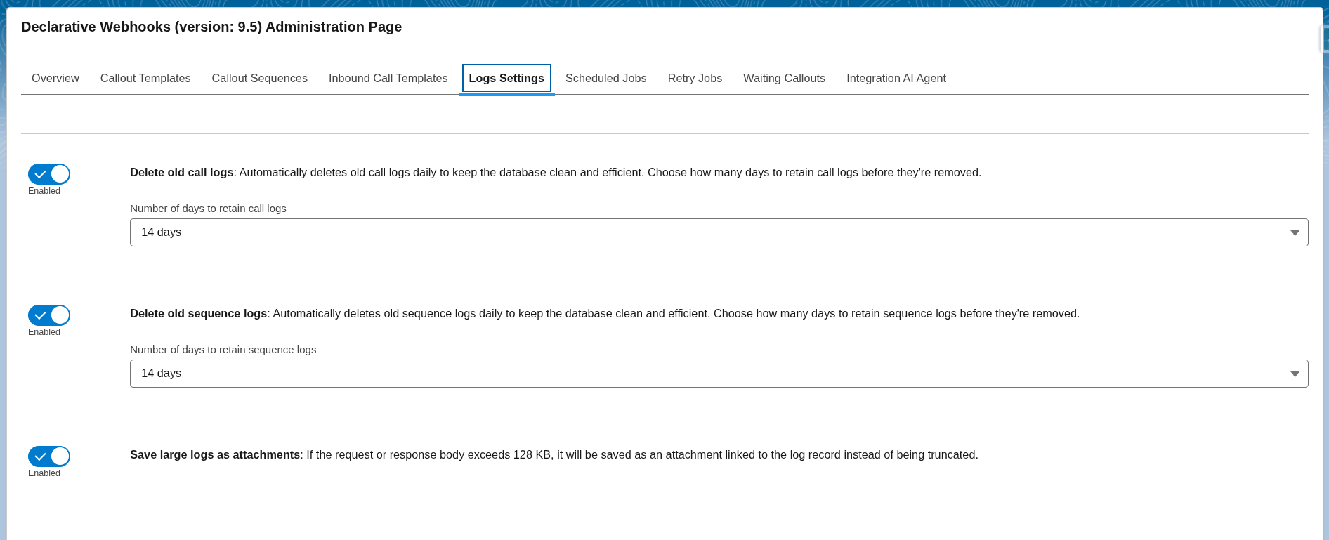 You can also choose to save large request and response bodies as attachments. Normally, bodies larger than the 128 KB limit of a long text field are truncated. By enabling this feature, Declarative Webhooks will store oversized bodies as attachments instead. Don’t worry! The Log View page automatically retrieves the body from the attachment and displays it seamlessly.