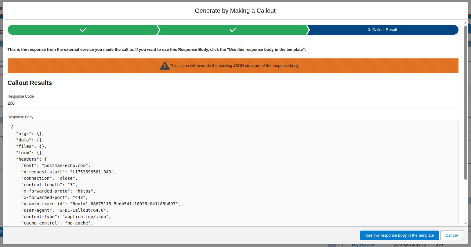After the call is done, you can review the response and either use that response to define the structure of the response body or cancel.