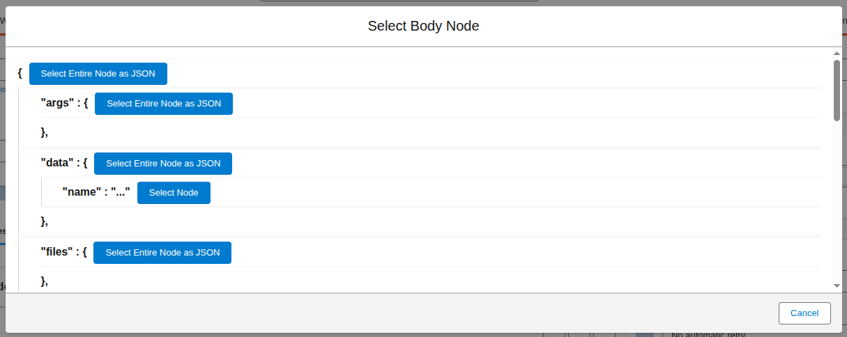 - Selecting Response Body Node will allow you to update the field with a value or an entire node from the Response Body:
