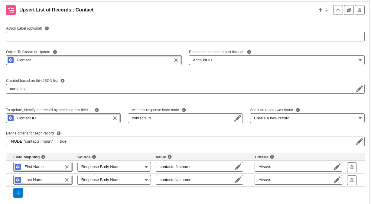 This option enables you to update a list of records based on a JSON list from the response. Each record can be identified by matching a Salesforce field with a node value. If no record is found for each list item, then you have the option to create it.