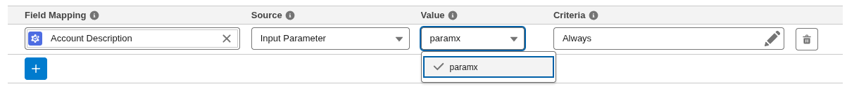 - Input Parameter: This allows you to map an Input Parameter received by the template into a Salesforce field. Learn more about using Input Parameters